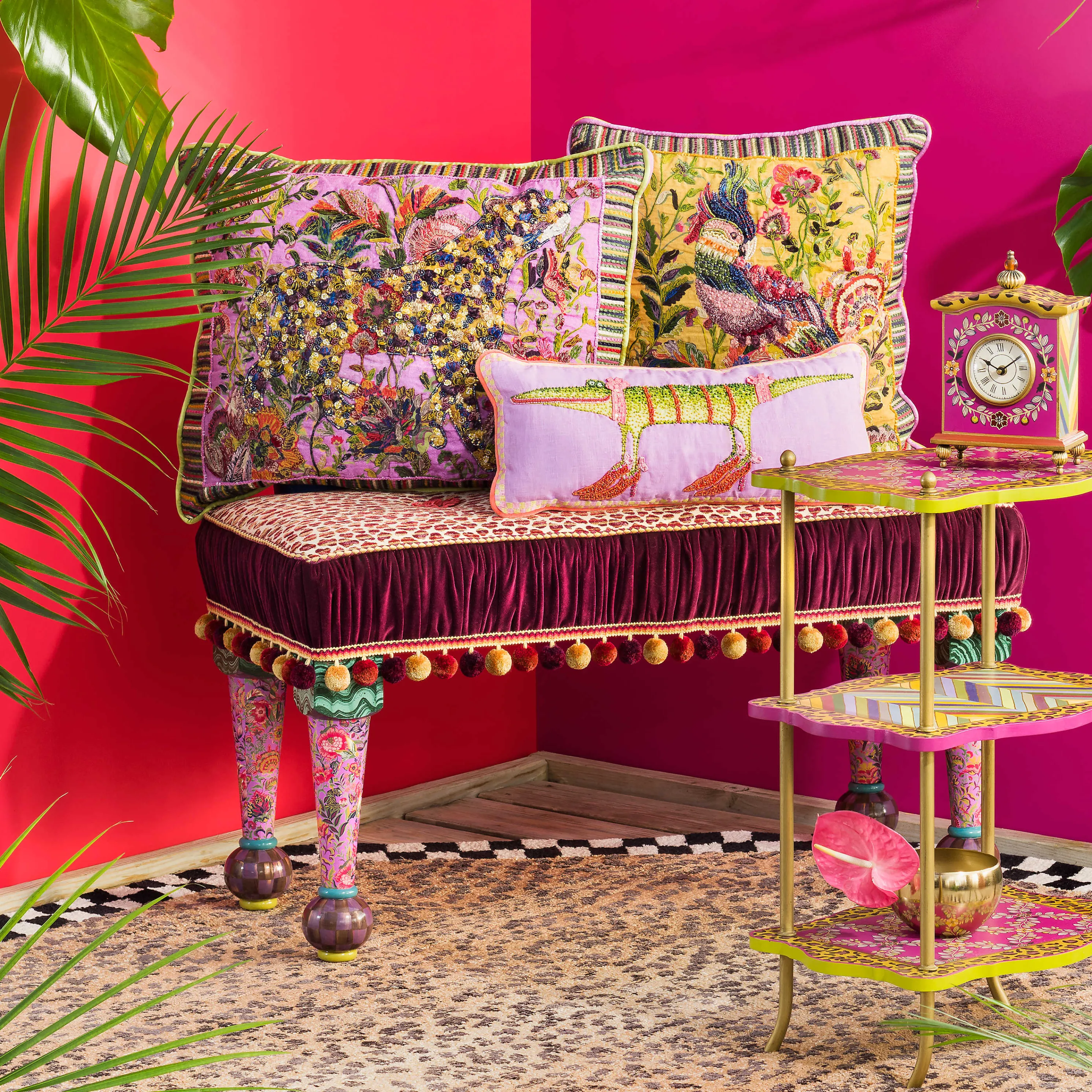 Patience Brewster’S Gloria Alligator Is A Tribute To Humor, To Kicking Up Your Heels, And To Grinning, No Matter What. The Patience Brewster Gloria Alligator Lumbar Pillow Is Embellished With Beading, Embroidery, Tiny Sequins, And A Bit Of Grosgrain Ribbon On A Background Of Cotton Linen.