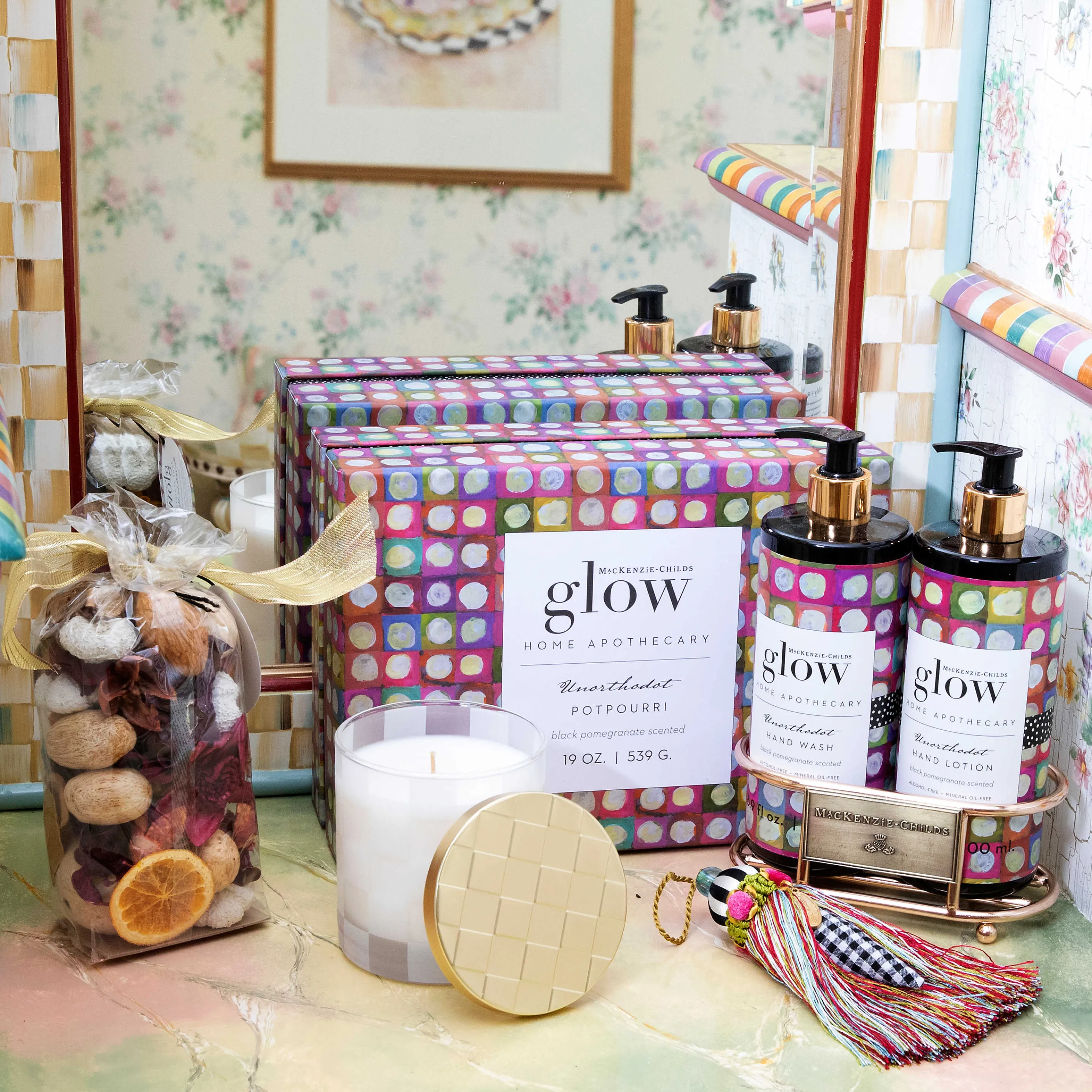 Mackenzie-Childs Glow Home Apothecary Defines The Essence Of Home With Fresh And Inviting Scents. Be Enlightened By Our 21-Ounce Unorthodot Candle, Which Is A Blend Of Palm And Paraffin Waxes With The Scent Of Fruity Black Pomegranate With A Woody Finish. This Candle, Which Burns Up To 66 Hours, Is Presented In A Checked Glass Vessel That Comes With A Metal Lid To Preserve The Scent When It Is Not Burning.