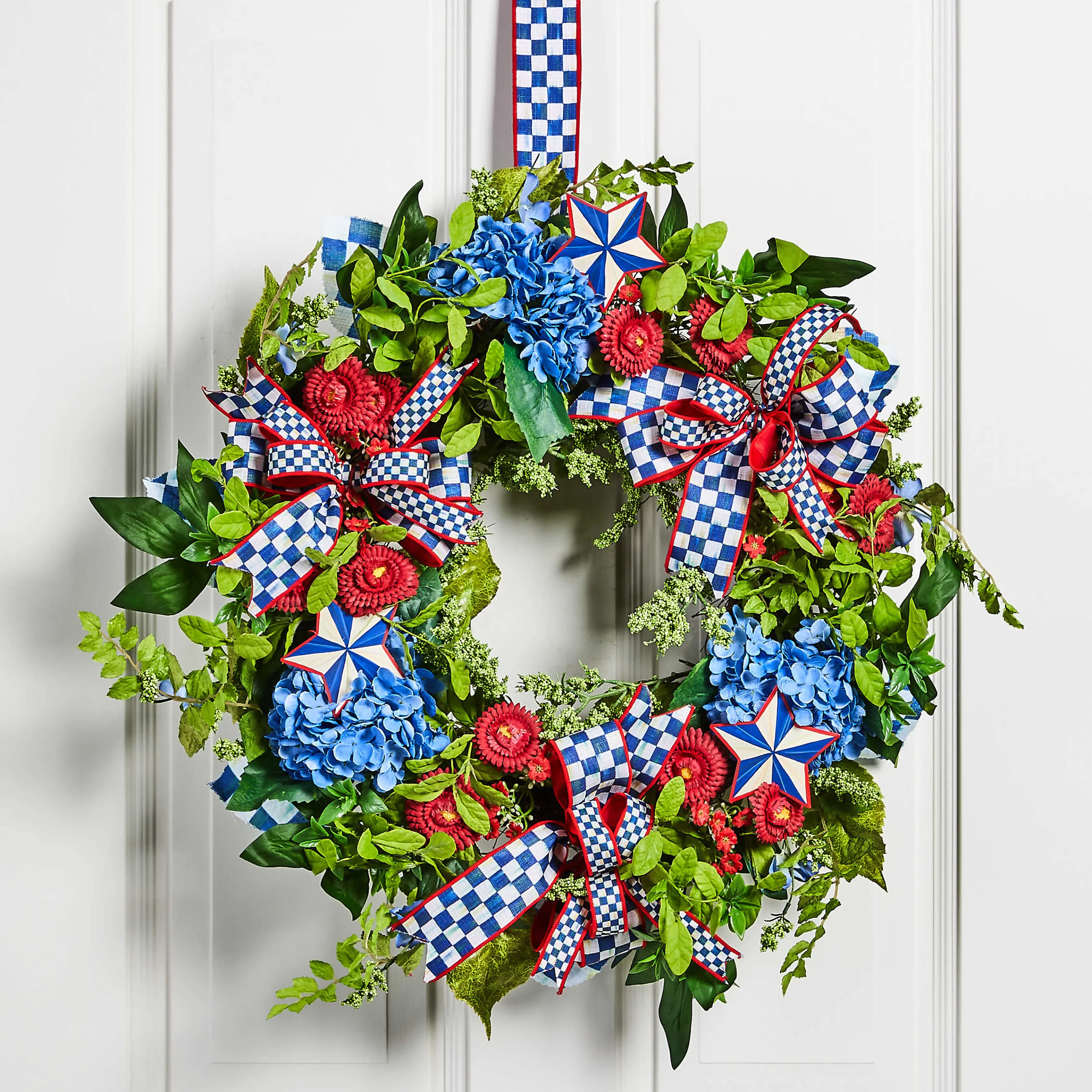 Go Red, White, And Royal Check! Our Americana Wreath Mixes Everlasting Blue Hydrangeas, Red Strawflowers, Royal Stripe Tin Stars, And Our Red-Backed Royal Check Ribbon. Hang It On Your Door For An All-Star Salute To Summer.