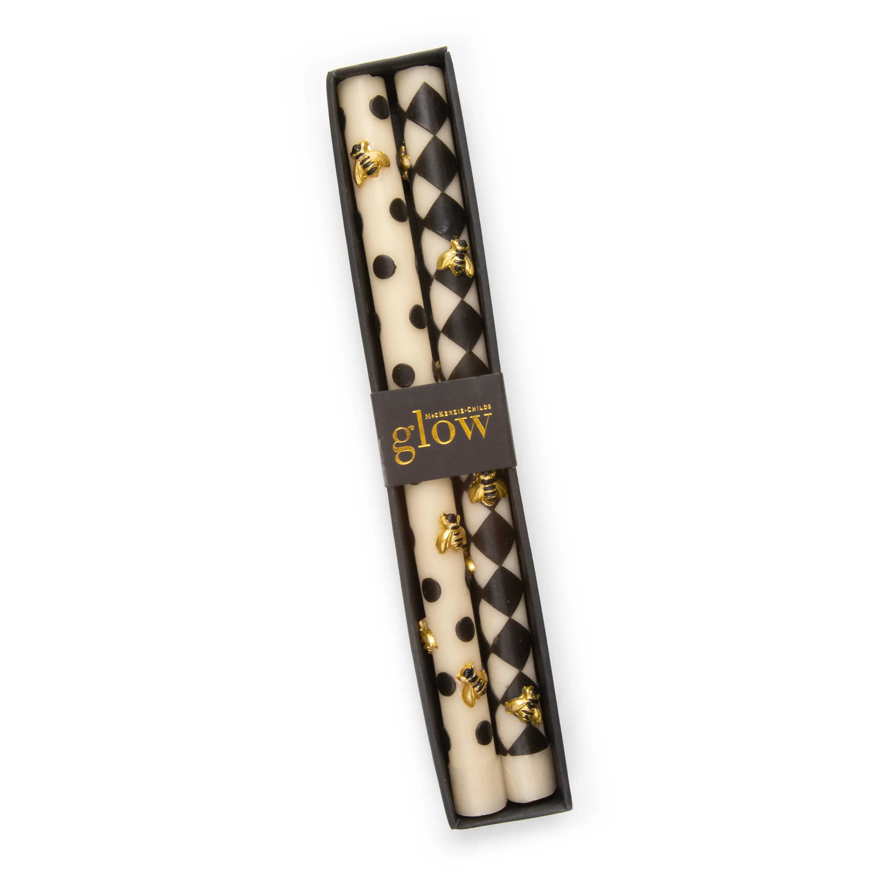 Light Up A Room With Summery Style Any Time Of Year. Black Bee Dinner Candles Feature Stripe And Harlequin Patterns With Whimsical Metallic Gold Bees. Set Of Two Hand Decorated Candles; Paraffin Palm Wax Blend.