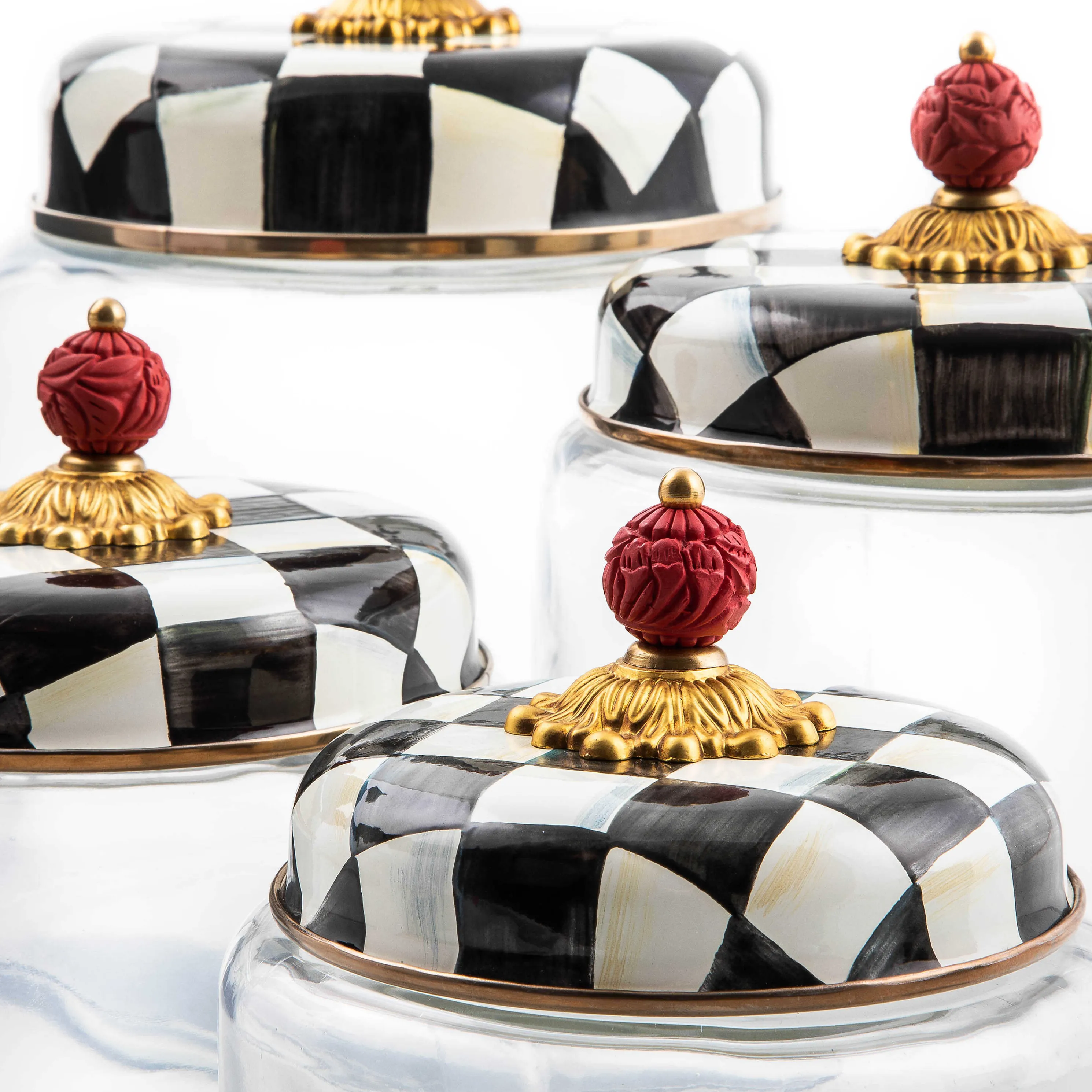 Keep Storage Spaces, Including The Pantry, Laundry Room Or Craft Room, Neat And Tidy In Mackenzie-Childs Style With The Big Courtly Check® Storage Canister. The Clear Glass Jar Puts Contents Conveniently On Display, Topped With Our Color-Dragged Black And White Pattern And A Pretty Faux Cinnabar Knob On The Lid.