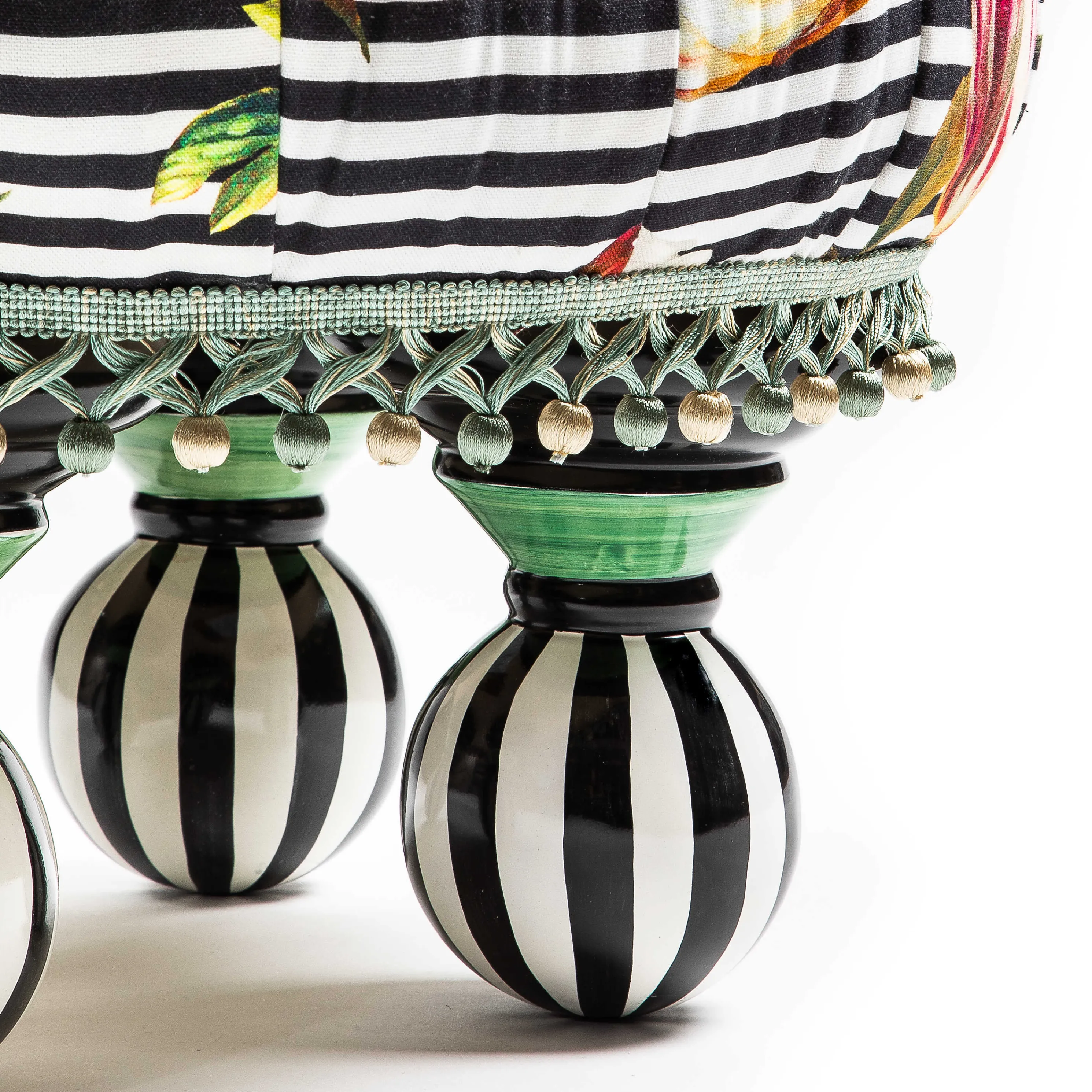 The Flower Show Tuffet Is The Armchair Accent That’S In Full Bloom. Created Top To Bottom By Our Artisans In Aurora, New York, It’S Upholstered In An Exuberant Striped And Floral Print, Accented With A Fabric-Covered Button, Outlined With A Pleated Ribbon Ruff In Its Center, And Trimmed With Ball Fringe All Around. This Playful Perch Sits On Four Handmade, Hand-Glazed Majolica Legs, Hand-Painted With Black And White Stripes.