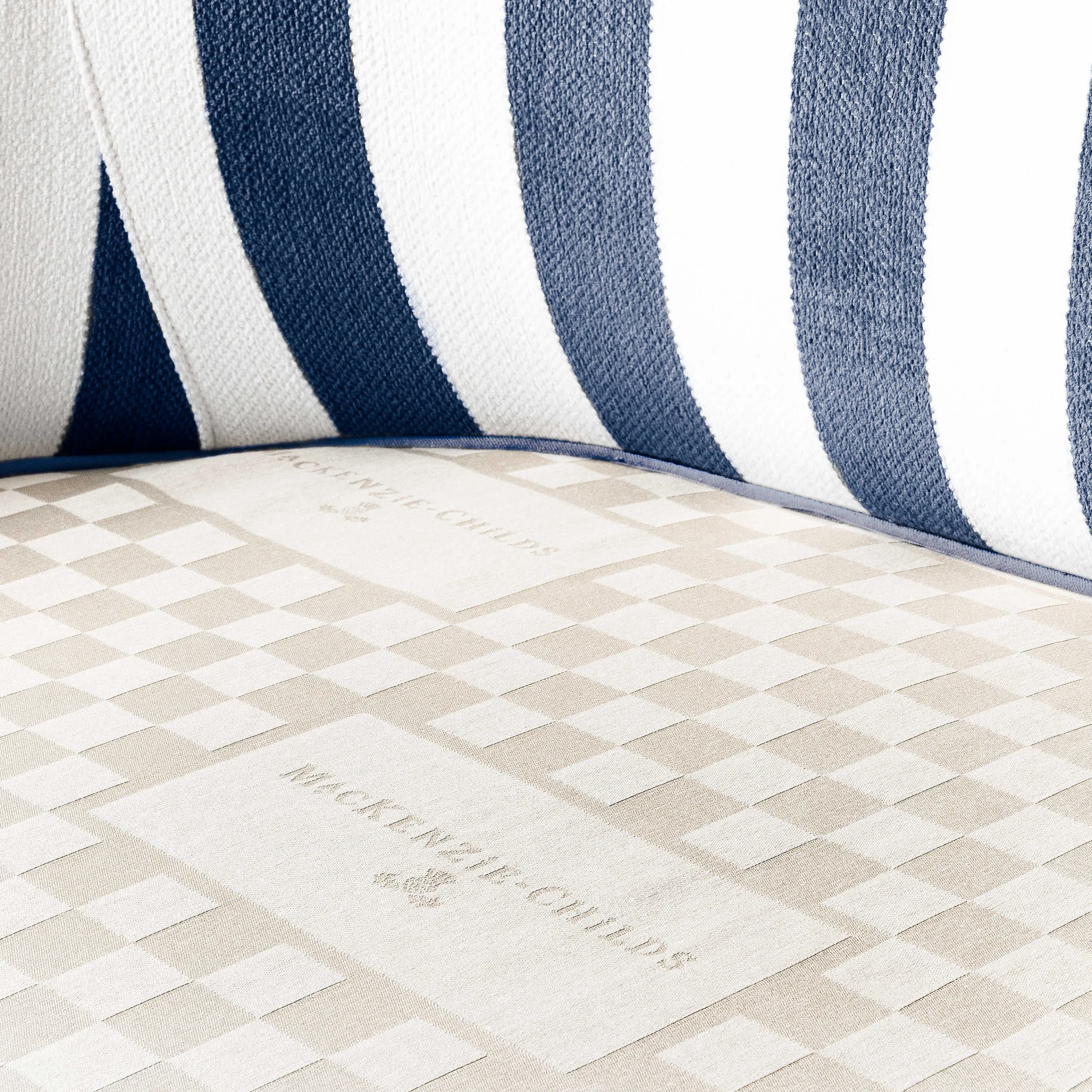 Put Your Showstopping Style Up In Lights. The Chenille Navy Stripe Marquee Loveseat Is A Versatile Striped Silhouette That Stands On Its Own And Mixes And Matches With Solids And Patterns. Features Include Domestic Hardwood Frame, Upholstery-Weight Chenille, Contrasting Welt, And Our Exclusive Fabric Decking Underneath The Loose Seat Cushion. The Finishing Touch Is Two 20″ Periwinkle Velvet Pillows With Black And White Checked Cording.