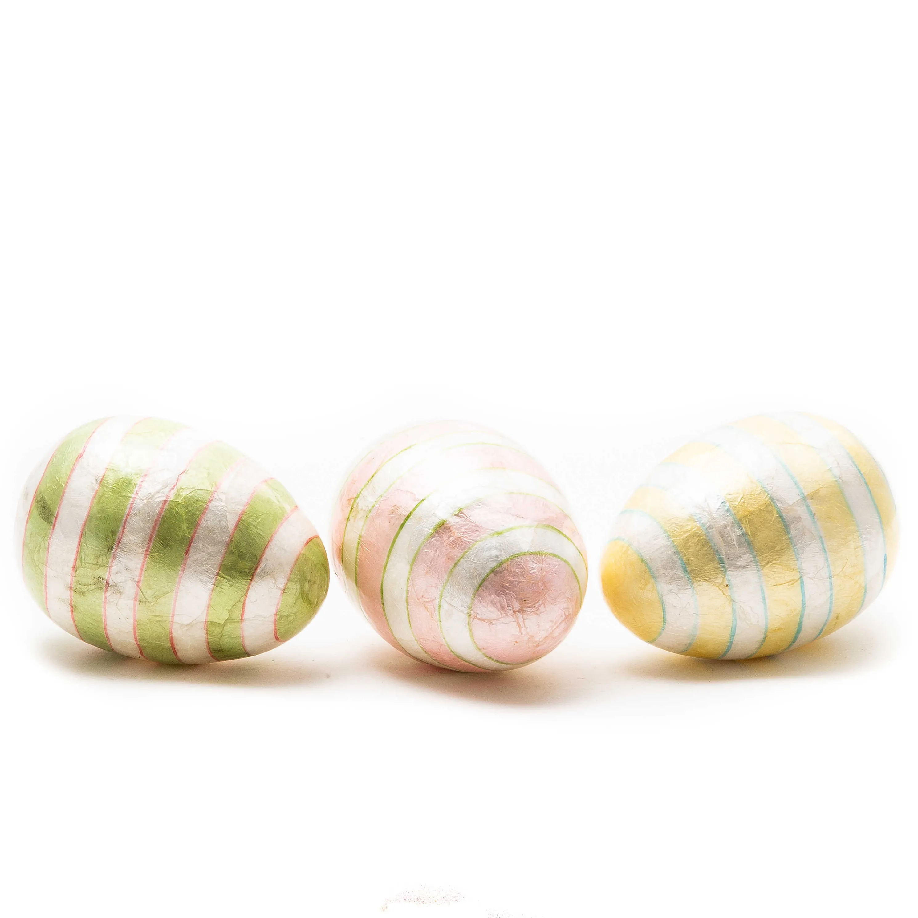 Our Set Of Three Rose Garden Stripe Eggs Make A Statement For Spring. Made Of Capiz, They’Re Decorated With Pastel Stripes And Presented In A Wooden Crate. Display Them On Their Own Or With Our Other Capiz Eggs.
