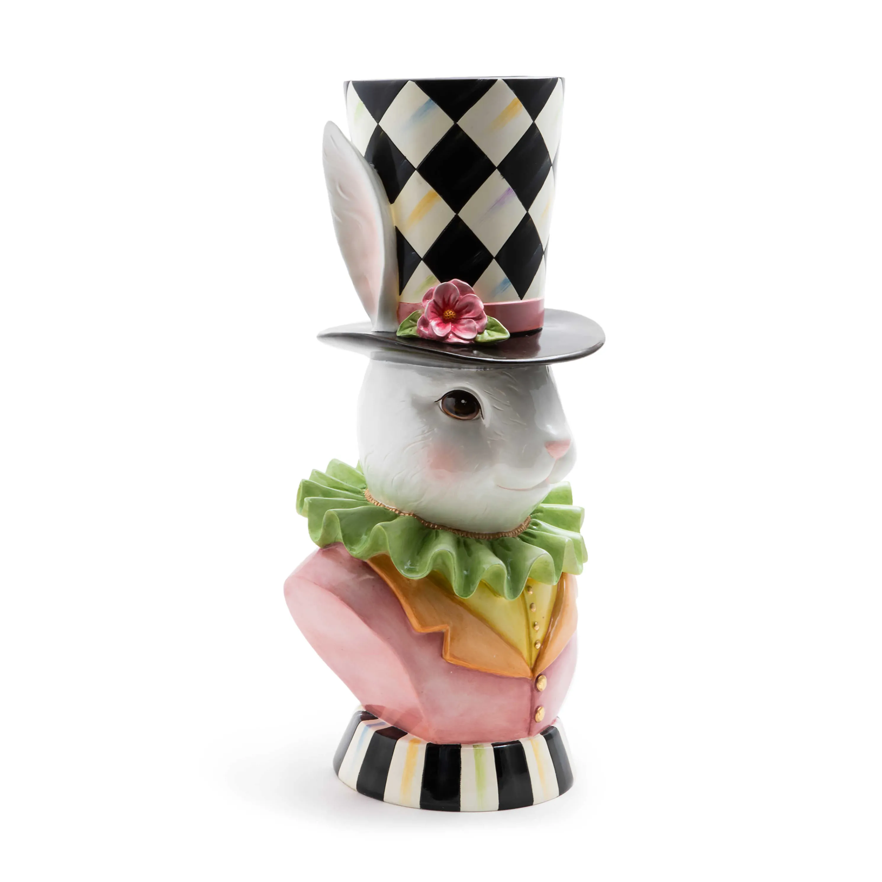Our Rose Rabbit Planter Is Simply Spectacular. Made Of Resin, This Dapper Bunny, Atop A Courtly Stripe Base, Is Hand-Painted With A Courtly Harlequin Hat That Can Hold Faux Florals.