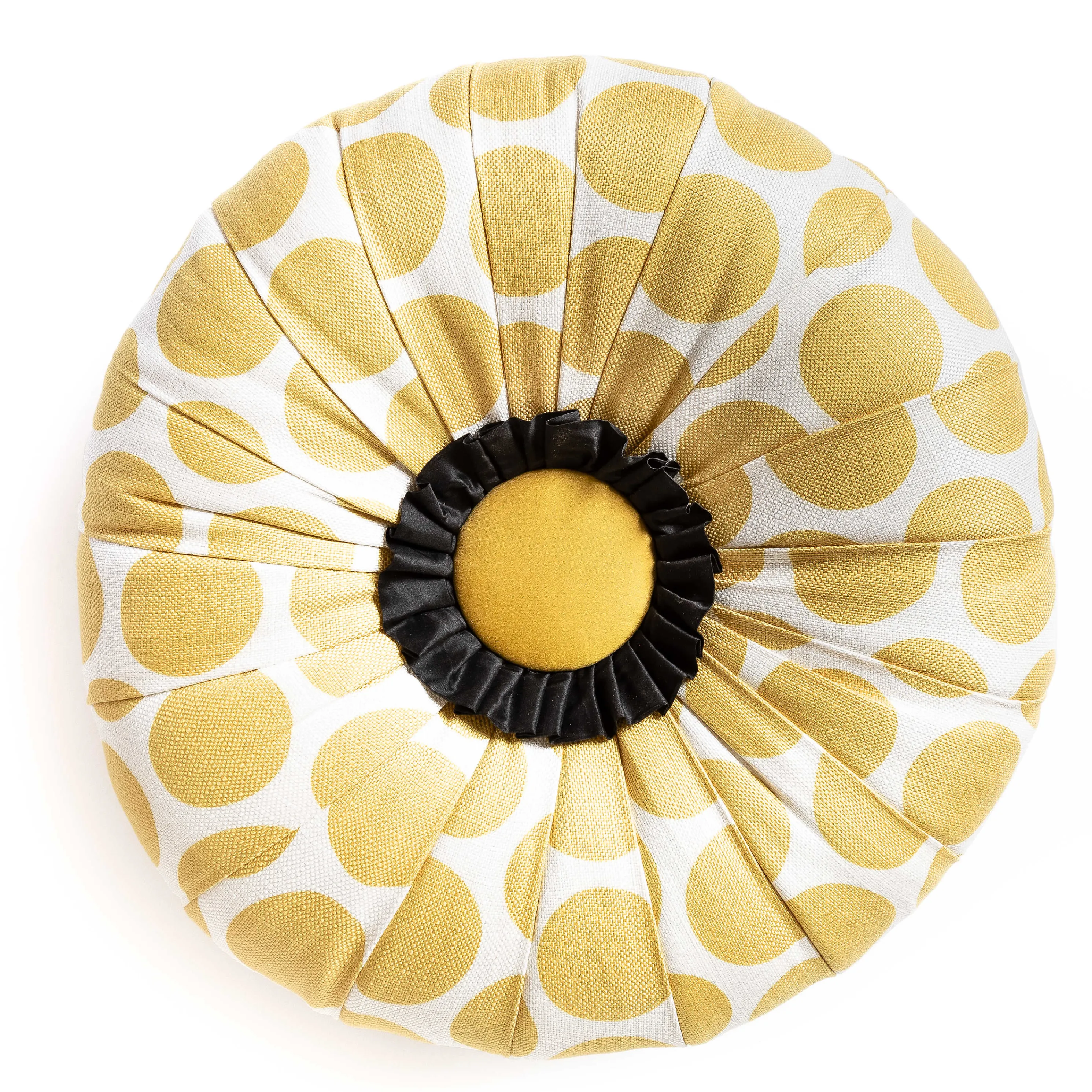 Created Top To Bottom By Our Artisans In Aurora, New York, The Buttercup Spot On Tuffet Is Upholstered In Bold Buttercup Dots, Accented With A Fabric-Covered Button Outlined With A Pleated Ribbon Ruff In Its Center, And Trimmed With Threaded Ball Fringe. This Playful Perch Sits On Four Handmade, Hand-Glazed Majolica Legs, Hand-Painted With Black And Buttercup Dots.