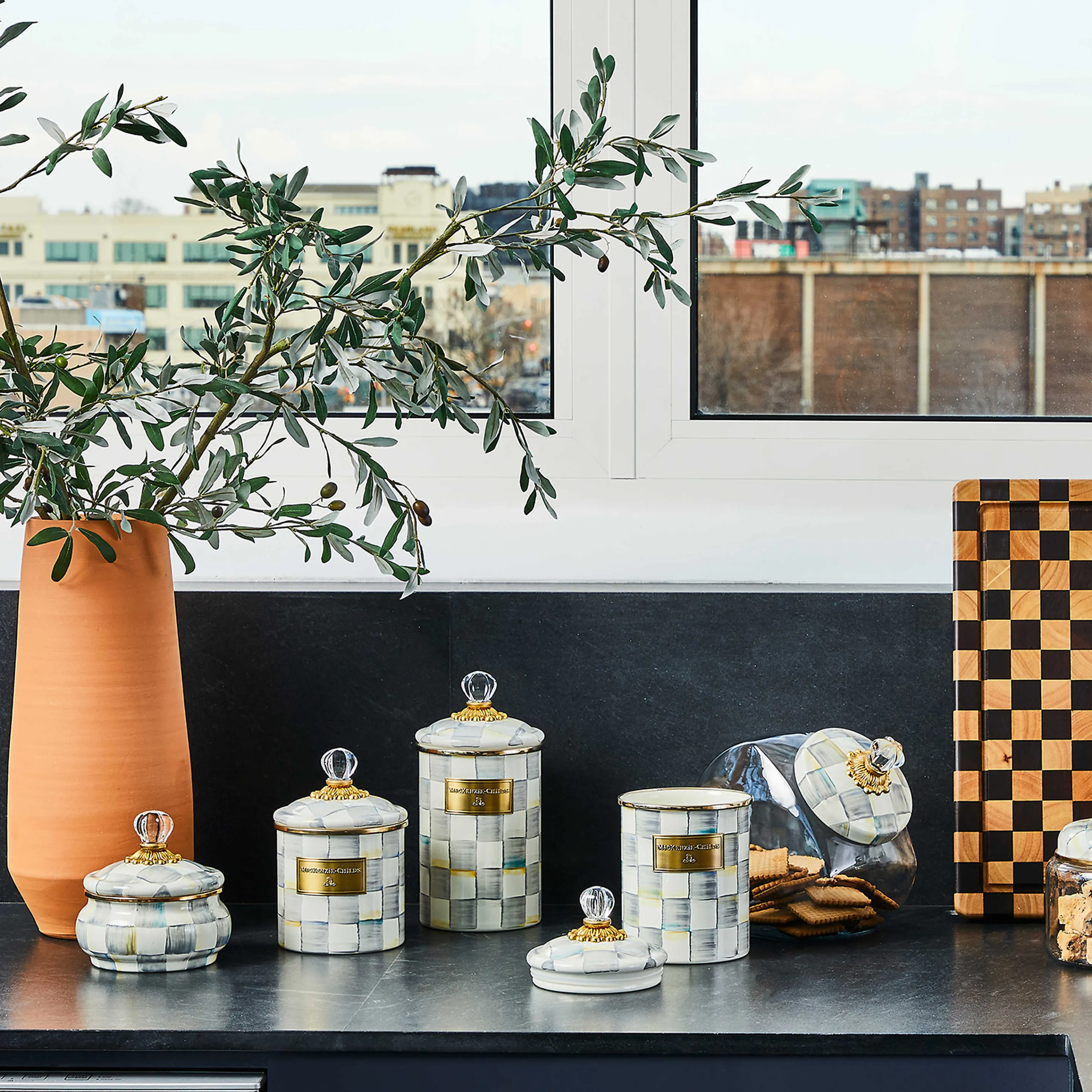 The Sterling Check Enamel Squashed Pot More Than Pulls Its Weight, Because This Chubby Silhouette Holds An Impressive 20 Ounces. Its Heavy-Gauge Steel Underbody Is Color-Glazed, Hand-Painted With Color-Dragged Checks In Subtle Shades Of Grey, Rimmed In Bronzed Stainless Steel, And Topped With An Elegant Clear Glass Knob.