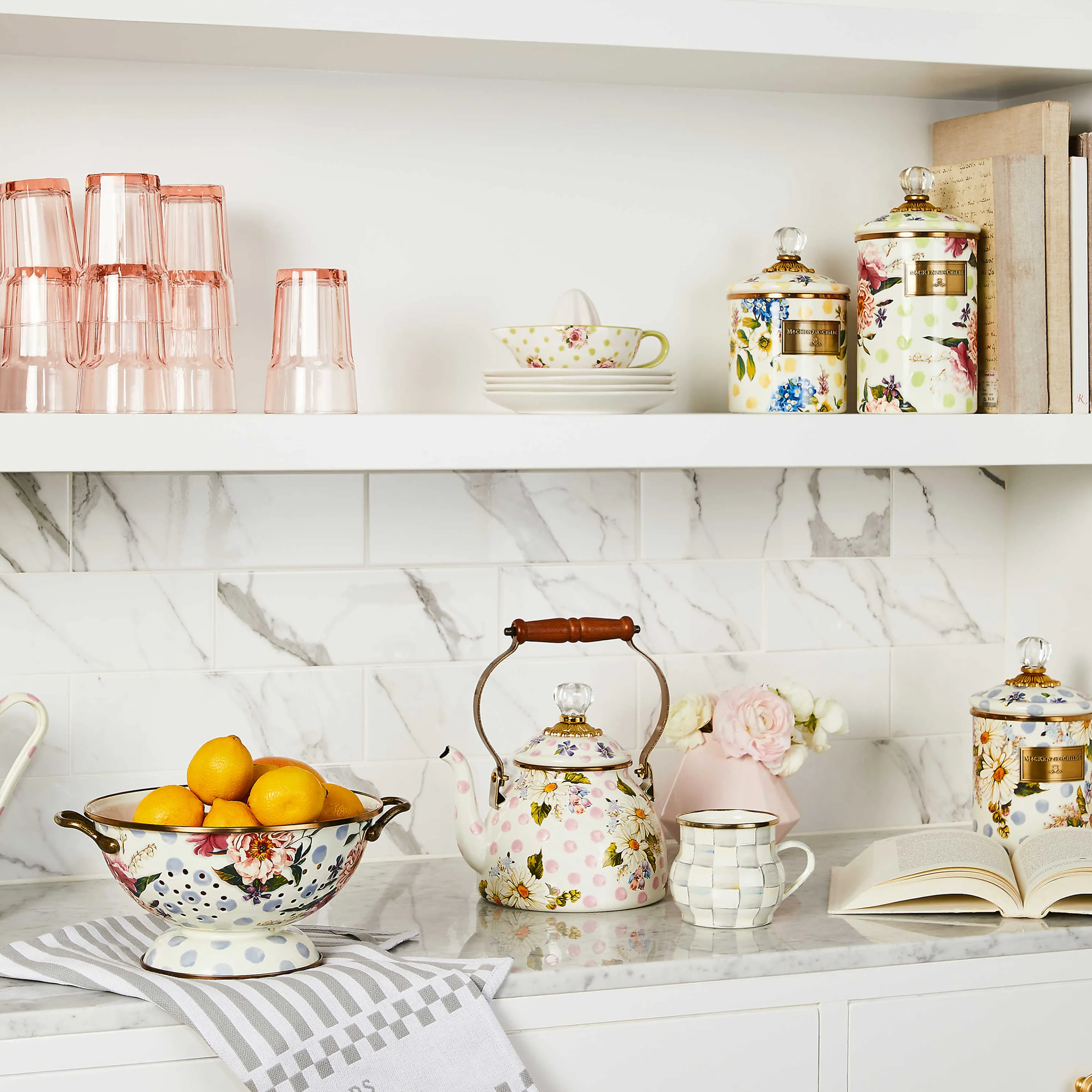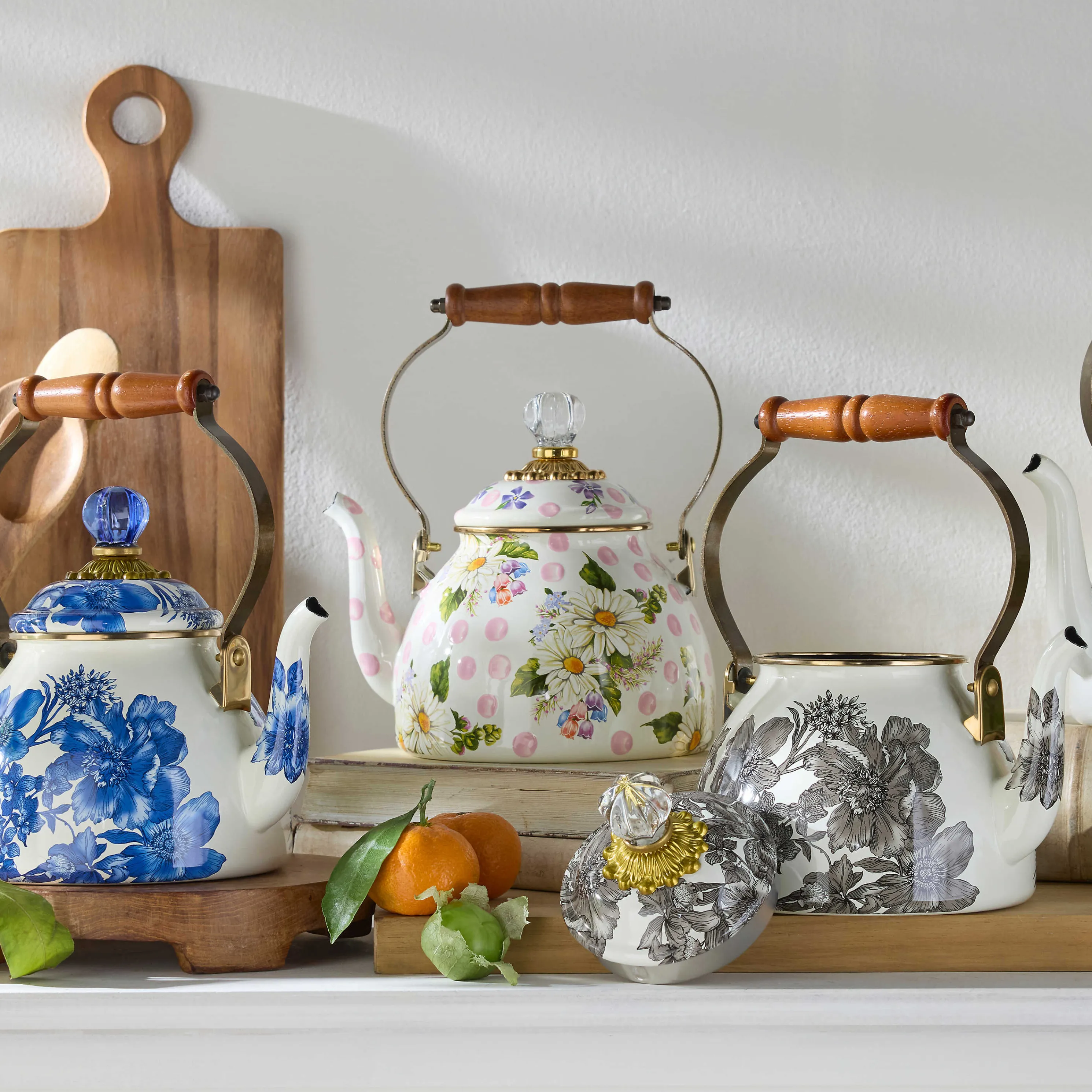 Bubbling Over With Mackenzie-Childs Style, Our Pink Wildflowers Enamel 2 Quart Tea Kettle Will Have You Finding New Reasons To Put The Kettle On To Boil. The Heavy-Gauge Steel Underbody Is Decorated With Hand-Applied Floral Transfers On Hand-Painted Pink Splots And Rimmed In Bronzed Stainless Steel. Wood Handle And Glass-Topped Lid. Gorgeous Filled With Fresh-Cut Flowers Or Greens, Too.