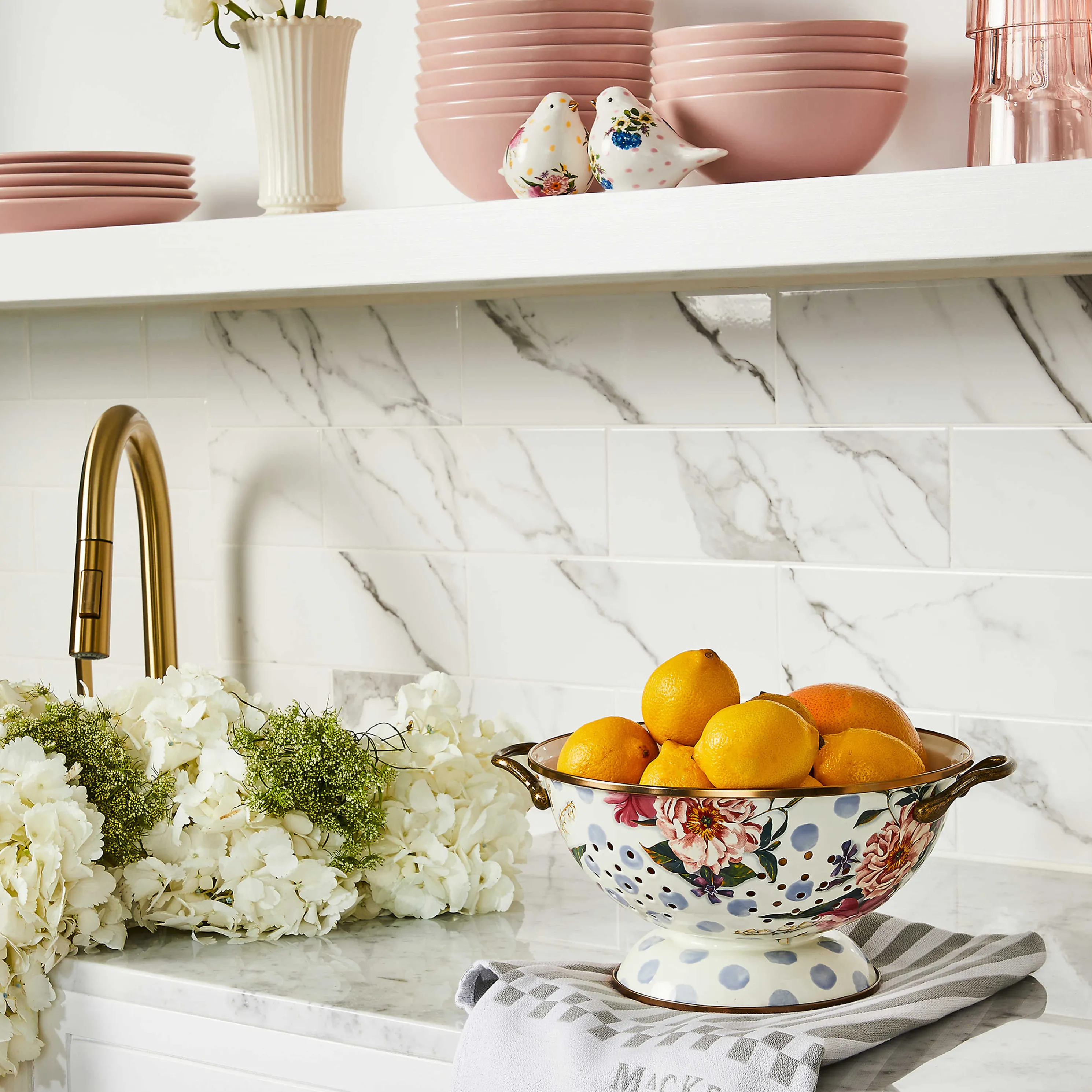 Give Stainless Steel’S Impersonal Style And Plastic’S Halfhearted Work Ethic The Pink Slip. There’S A New Sous Chef In Town! For Kitchen Preparations With Personality, Look No Further Than The Blue Wildflowers Enamel Large Colander. Fill With Veggies Grown In Your Own Garden Or Hand-Picked Strawberries For A Pleasing Host Gift. Color Glazed In White, Each Colander Is Decorated With Hand-Applied Floral Transfers On Hand-Painted Blue Splots.